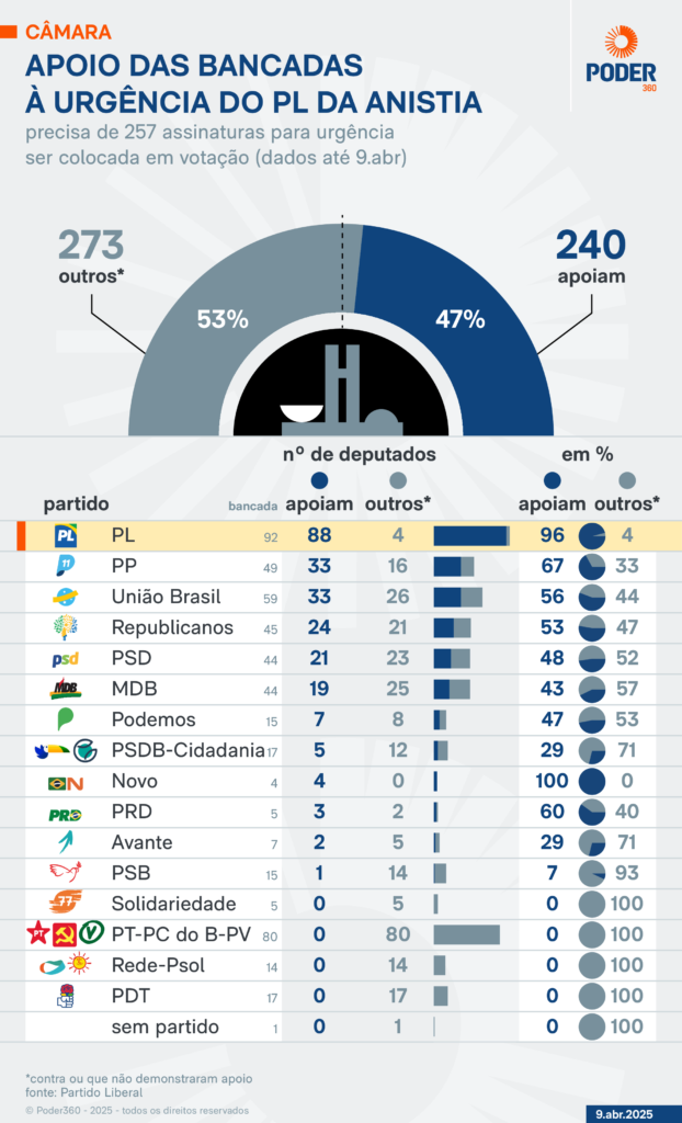 O PL, partido de Bolsonaro, concentra o maior apoio: 88 de 92 deputados da bancada já assinaram a urgência. PP e União Brasil, ambos com ministérios na Esplanada do presidente Luiz Inácio Lula da Silva (PT), vêm na sequência, com 33 assinaturas cada um.