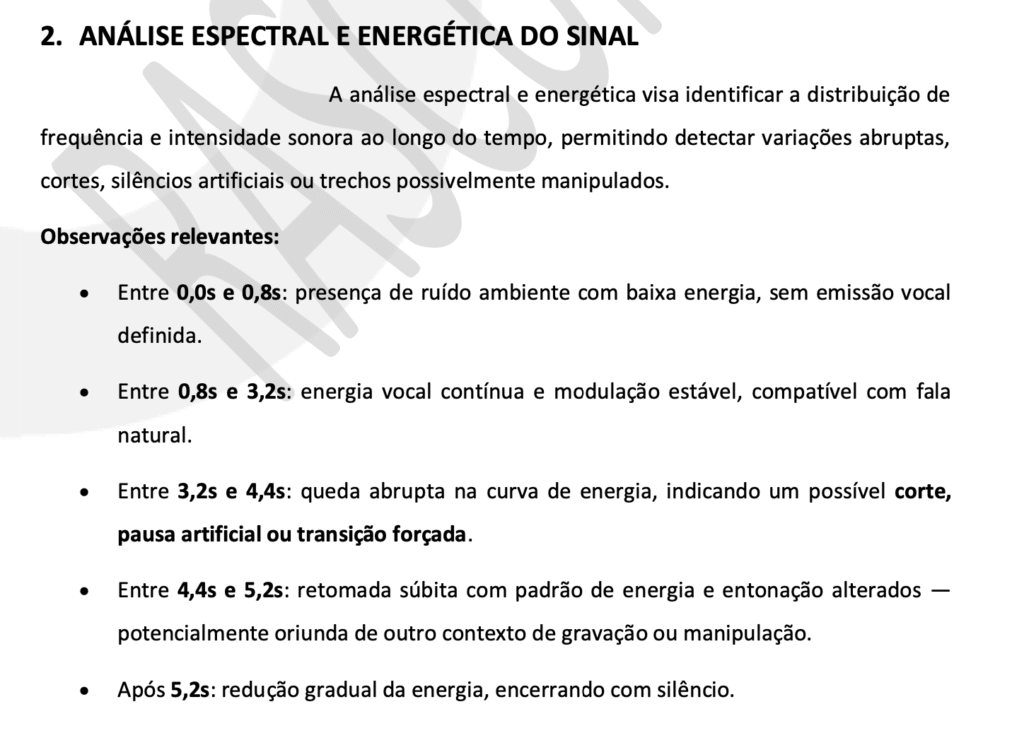 O documento afirma que o trecho final do áudio, entre os segundos 4,4 e 5,2, mostra fluidez artificial, ausência de variações naturais e ausência de marcas fisiológicas da fala humana — aspectos comuns em vozes geradas por deepfake. O laudo foi feito com base em normas da ABNT ISO/IEC 27037, diretrizes da Meta (Facebook/Instagram) e Google Vertex AI.
