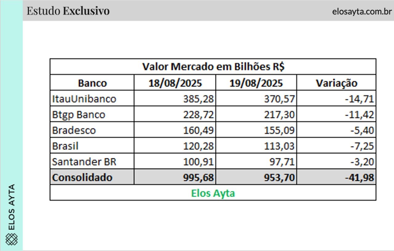 Cinco grandes bancos brasileiros perderam R$ 41,98 bilhões em valor de mercado nesta terça-feira, 19. O montante equivalente ao valor de mercado da Caixa Seguradora, hoje avaliada em R$ 40,74 bilhões. Os dados são da consultoria Elos Ayta.