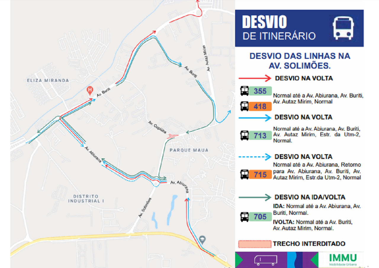 As linhas de ônibus 355 e 418 vão seguir normalmente até a avenida Abiurana, depois até a avenida Buriti, avenida Autaz Mirim e seguem o itinerário normal.