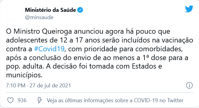 O ministro da Saúde, Marcelo Queiroga, anunciou hoje (27) que adolescentes de 12 a 17 anos serão incluídos no Plano Nacional de Imunização (PNI) contra a covid-19. A inclusão será iniciada após envio da primeira dose para a vacinação de adultos com mais de 18 anos. Adolescentes com comorbidades serão os primeiros a serem imunizados.