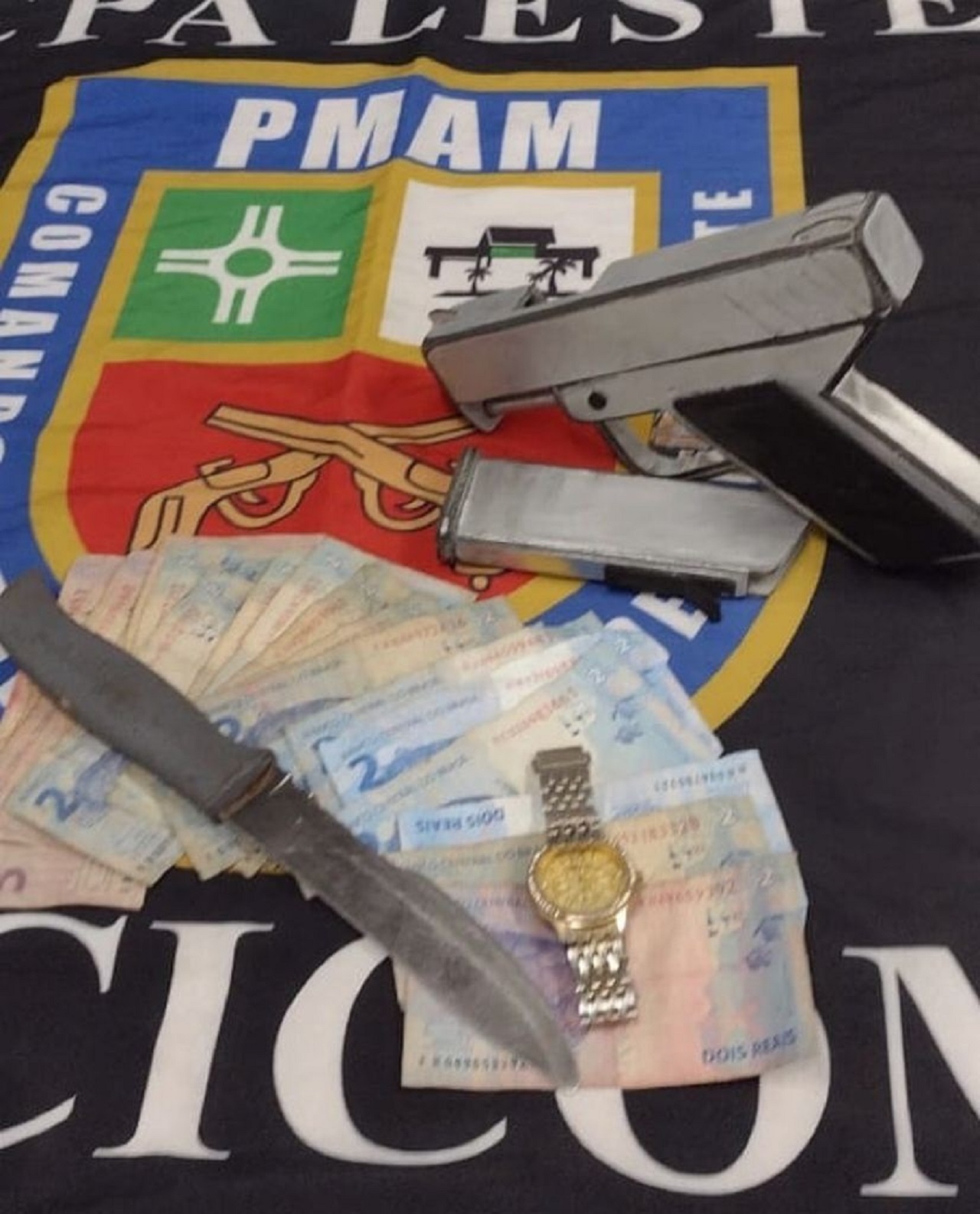 A equipe iniciou buscas e localizou os suspeitos ainda na avenida Autaz Mirim. Ao notarem a aproximação da guarnição, os indivíduos começaram a se desfazer das armas e de todo o material roubado, jogando-os em via pública, mas foram detidos em seguida.