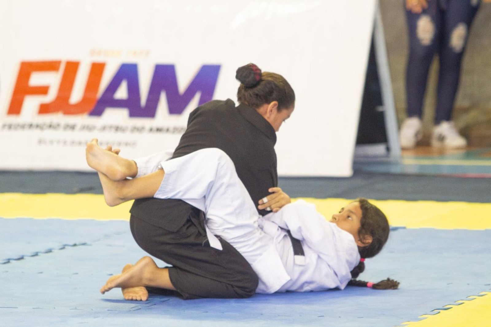 Rafaele Oliveira, de 8 anos de idade, atleta amazonense de jiu-jitsu e aluna do núcleo Santa Etelvina, foi destaque na categoria mirim pesado levando a medalha de ouro. “Foi muito legal, fiquei em primeiro lugar, minha adversária entregou o braço e eu finalizei, me sinto feliz”, disse.