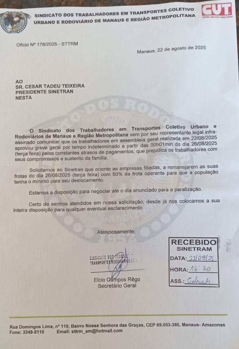 decisão do Sindicado dos Trabalhadores em Transporte Coletivo Urbano e Rodoviário de Manaus e Região Metropolitana (STTRM) foi aprovada em uma assembleia geral realizada ainda na sexta-feira (22). O documento, que oficializa a greve, diz que a paralisação vai começar a partir do primeiro minuto da próxima terça-feira (26) e deve seguir por tempo indeterminado.