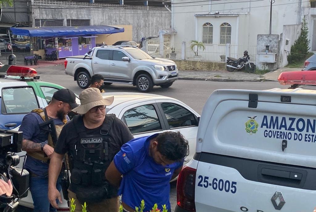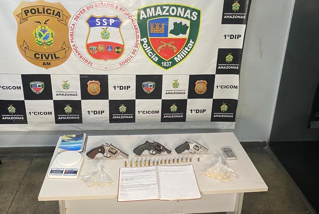 Manaus – Adailson Esquerdo dos Santos, 28, foi preso com três armas de fogo, drogas e cadernos do tráfico. A prisão aconteceu na tarde desta quinta-feira (4), durante operação, na zona sul de Manaus. Conforme informações do capitão Almeida, na Rua Boa Esperança, bairro Crespo, a equipe recebeu informações de que um homem, vestido de camiseta azul, estava com uma arma de fogo e vendendo drogas.