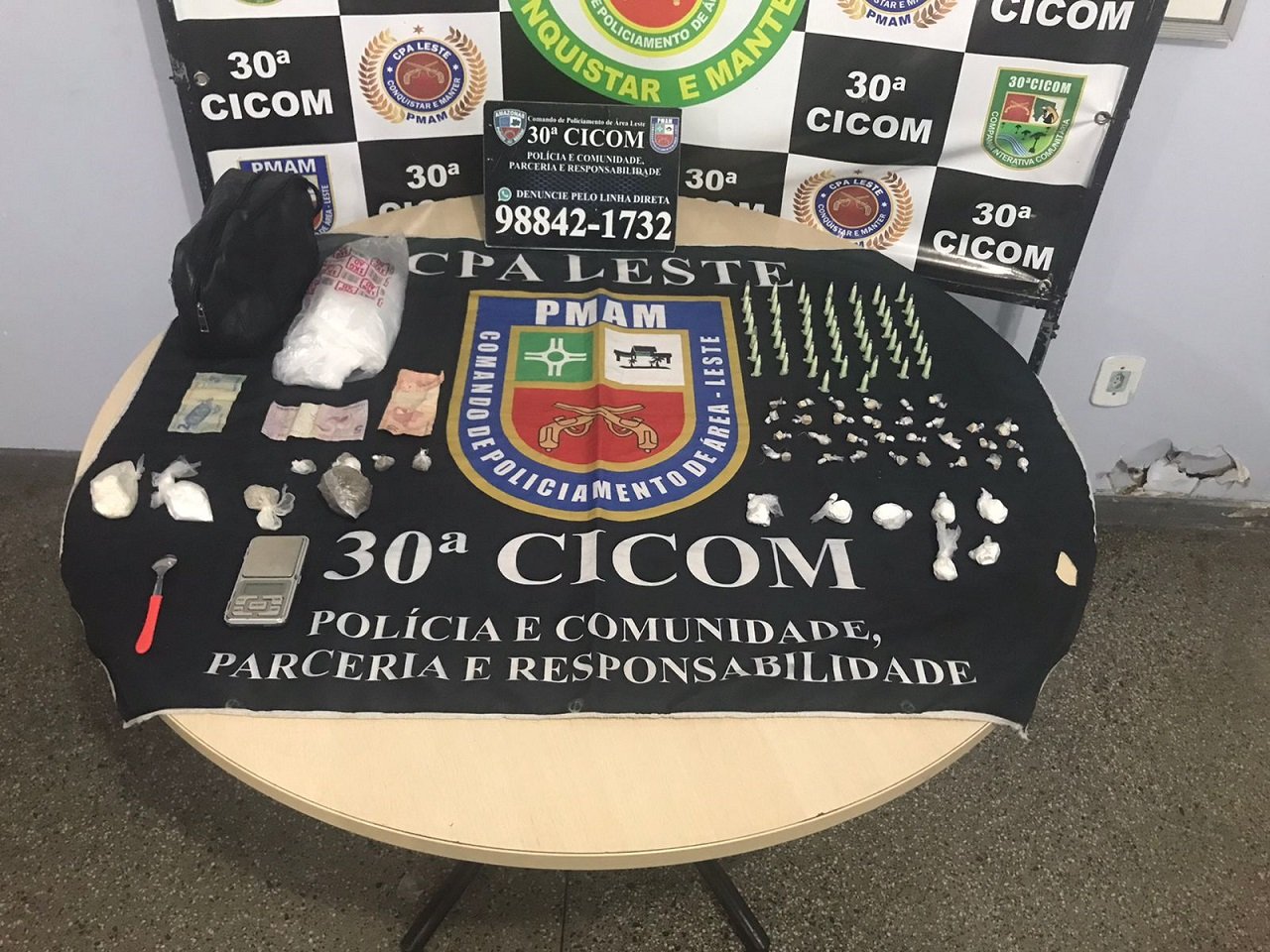 A prisão ocorreu após denúncia recebida pelo aplicativo Linha Direta da Polícia Militar por volta das 2h40, informando sobre comércio de drogas que estaria ocorrendo na rua João Precinca, no Jorge Teixeira. Ao chegar ao local, militares das viaturas 7102, 7114, 7120 e 7126 identificaram o suspeito segurando uma bolsa, no pátio de uma residência.