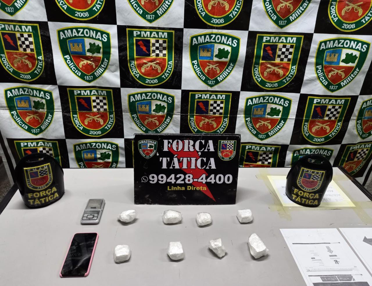 No bairro Novo Israel, durante patrulhamento na rua Brasil, por volta de 22h, a equipe Força Tática avistou um indivíduo em atitude suspeita. Com a aproximação dos militares, ele jogou uma sacola para um terreno próximo. O objeto foi encontrado após buscas no local, com sete porções médias de substâncias entorpecentes com características de cocaína. O suspeito também portava uma porção de substância média do mesmo tipo, além de um celular e uma balança digital. Diante dos fatos, ele foi apresentado no 6° DIP, onde se constatou que o indivíduo já possuía passagem por crime de receptação.