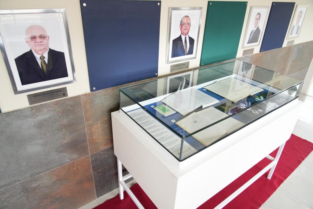 Além dos painéis, uma mesa expositiva reúne itens simbólicos da trajetória institucional, como o exemplar da Lei Complementar nº 1, de 30 de março de 1990 — que criou oficialmente a Defensoria Pública do Amazonas —, livros de posse de membros, as primeiras carteiras funcionais e broches da instituição. Muitos desses objetos são inéditos para o público e carregam valor histórico singular.