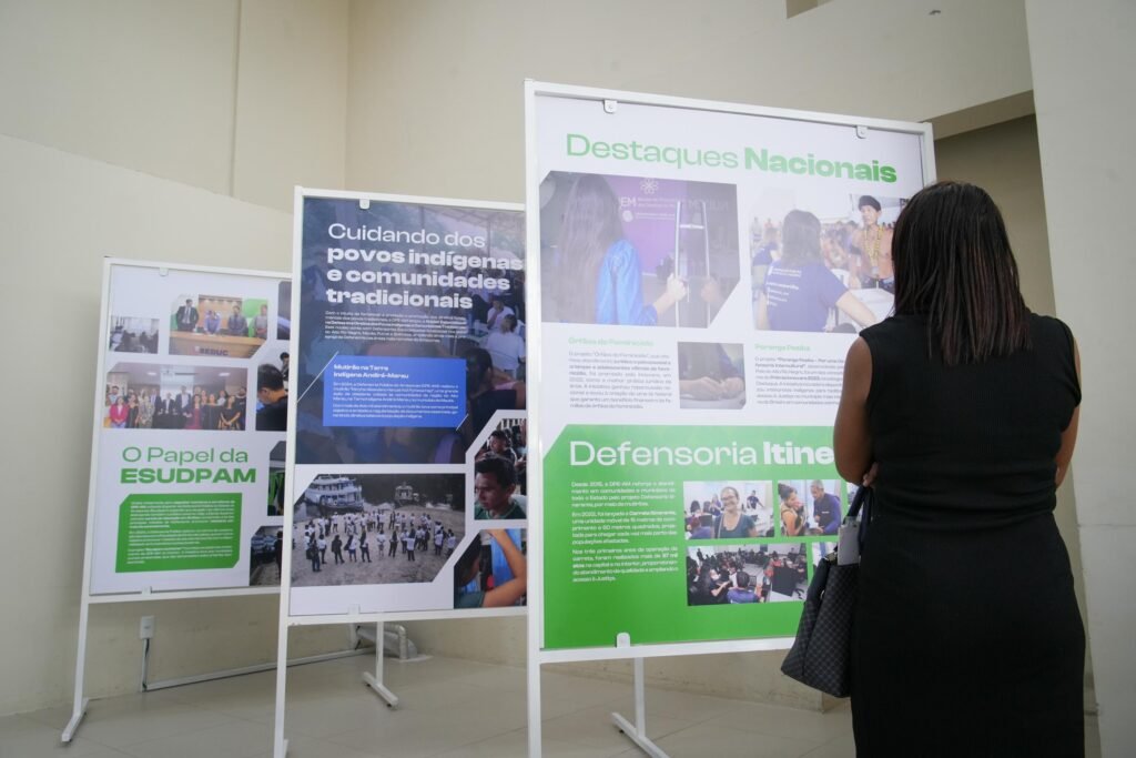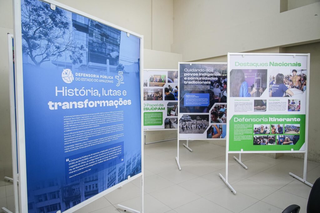 As estruturas apresentam fotografias históricas e textos explicativos que relembram as primeiras nomeações de defensores, a expansão para o interior do Estado, a implantação de sedes e a criação de projetos emblemáticos que levaram cidadania a todos os cantos do Amazonas.