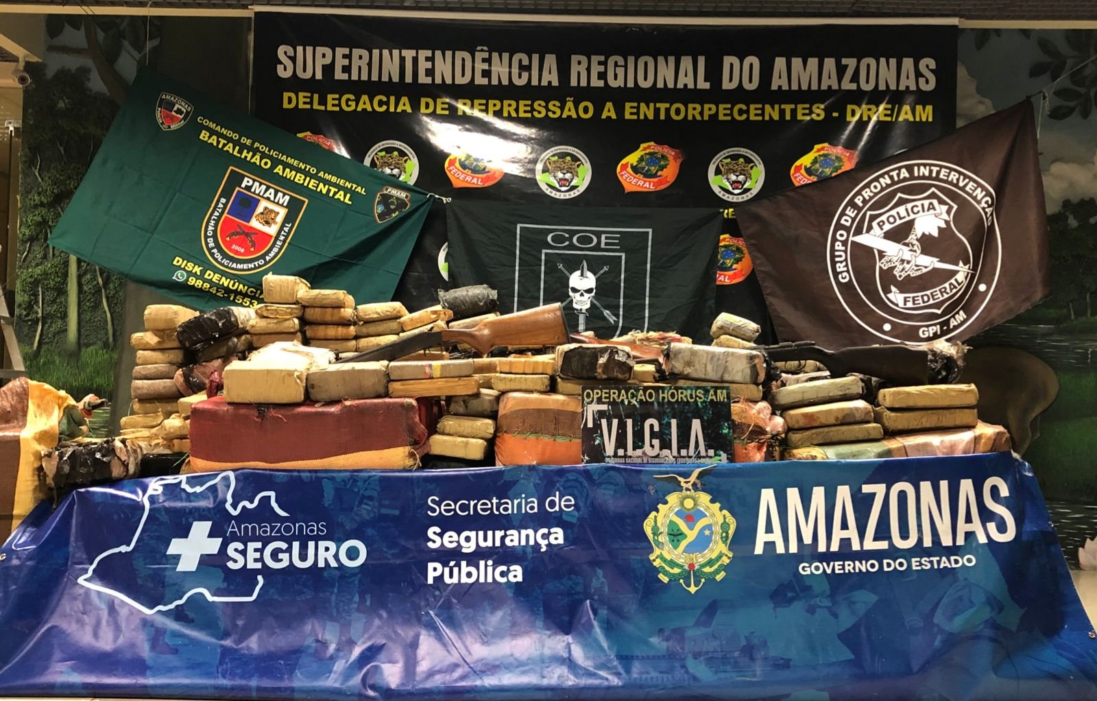 A Secretaria de Segurança Pública do Amazonas (SSP-AM), em ação com a Delegacia de Repressão a Entorpecentes (DRE), da Polícia Federal, apreendeu mais de uma tonelada de entorpecentes, três armas e prendeu um homem foragido da justiça. Ele estava sendo procurado pelo crime de tráfico de drogas.