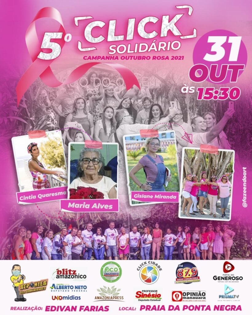 A quinta edição do projeto voluntário Click Solidário – Outubro Rosa, que tem o propósito de mostrar a beleza e auto-estima de mulheres em tratamento com Câncer, reunirá mulheres diagnosticadas com câncer de mama e terá como cenário a praia da Ponta Negra, zona Oeste de Manaus, no domingo (31), a partir das 15h30, para sessões fotográficas. O fotojornalista Edivan Farias, idealizador do evento avisa que esse ano é especial pois fará homenagem a três ex-participantes que resistiram bravamente em meio à luta pela vida.