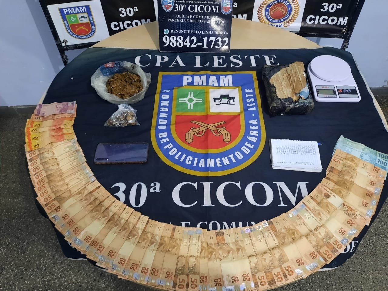 Os policiais foram ao local e encontraram a suspeita, que permitiu a entrada da equipe na casa. Após varreduras, os policiais encontraram, camuflado no forro do banheiro da residência, uma porção média de maconha e R$ 2.395 em espécie.