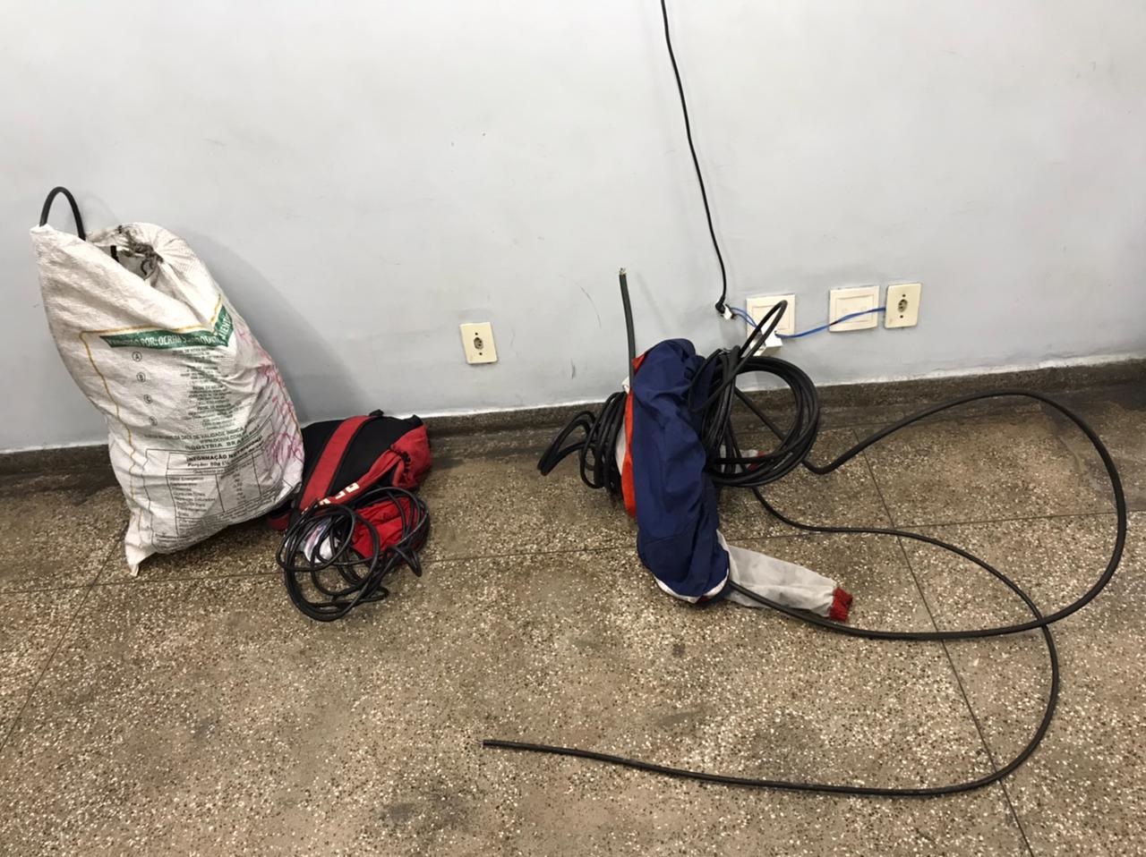 A equipe realizava patrulhamento na área, por volta das 2h40, quando recebeu informações do Centro Integrado de Operações Policiais (Ciops) sobre furto de cabos de internet na rua da Floresta. No local, os policiais se depararam com quatro suspeitos, entre eles uma mulher. Com eles foram encontrados fios de internet, em um saco de fibra e em uma mochila.