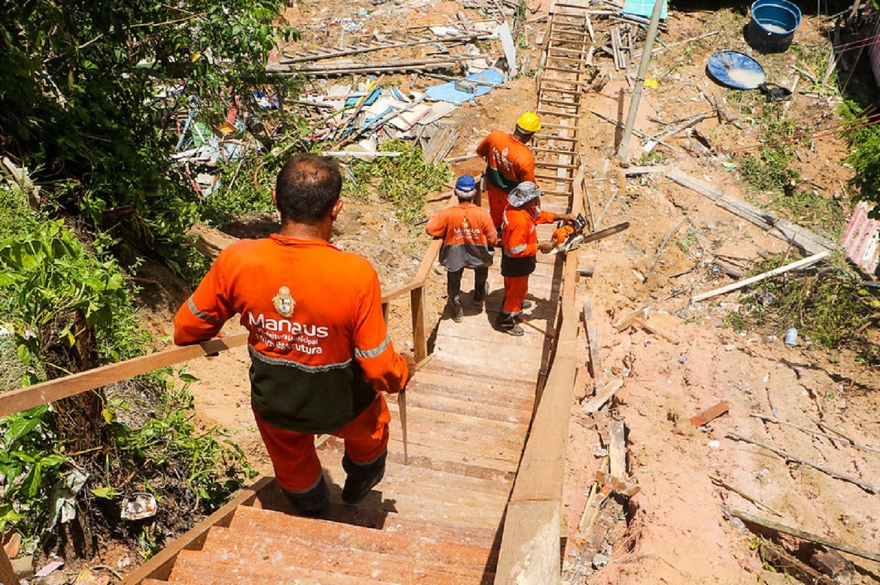 A Prefeitura de Manaus, por meio da Secretaria Municipal de Infraestrutura (Seminf), reconstrói, nesta quarta-feira, 29/3, uma escada de madeira com 50 metros de comprimento por 1,50 metros de largura na travessa Israel Bastos, bairro Armando Mendes, zona Leste de Manaus. A estrutura interliga o bairro à comunidade da Sharp, afetada pelas fortes chuvas do último fim de semana. Esse era o único meio de acesso dos moradores às vias principais.