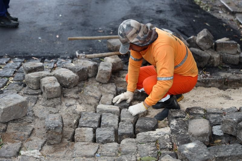 Além da pavimentação, a tradicional avenida Eduardo Ribeiro passa por restauração do pavimento em paralelepípedo com pedras portuguesas. O trabalho exige precisão e cuidado na aplicação manual das pedras e posterior fixação com concreto, preservando a estética histórica da via.
