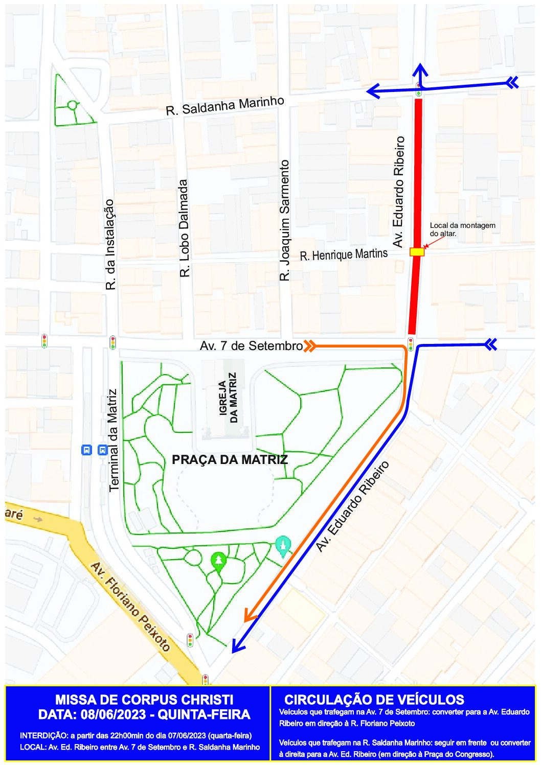 A Prefeitura de Manaus, por meio do Instituto Municipal de Mobilidade Urbana (IMMU), irá interditar a avenida Eduardo Ribeiro no trecho entre a avenida 7 de Setembro e a rua Saldanha Marinho, a partir das 22h desta quarta-feira, 7/6, para a realização da “Missa de Corpus Christi”, que ocorrerá na quinta-feira, 8/6, às 16h. Além da celebração, será realizada também uma procissão, ainda no feriado, que contará com interdições temporárias em outras vias do centro da cidade.